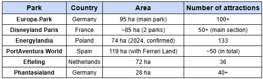 Although the question ‘Where is the largest theme park in Europe located?’ seems simple, the answer is complicated. ‘The largest’ can mean different things: area, number of attractions, technical records, or annual attendance. Depending on the criterion, the title of leader will go to a different park.