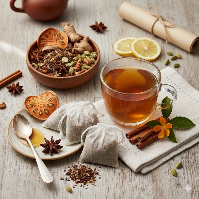 Tapee Tea is a multi-botanical Thai infusion designed around herbal harmony. Unlike regular tea made from Camellia sinensis, Tapee Tea contains no caffeine. Its flavor signature blends warming spices, citrus-soft fruit, and herbal aromatics to deliver a layered, soothing cup.