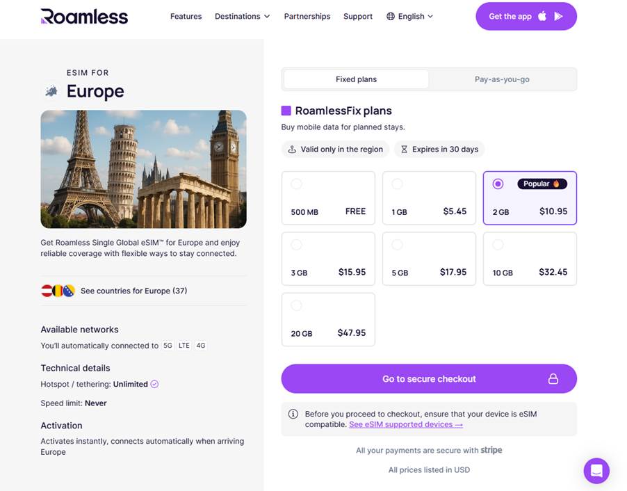 Roamless is ideal for travelers who want straightforward, hassle-free plans with reliable connectivity across Europe.
