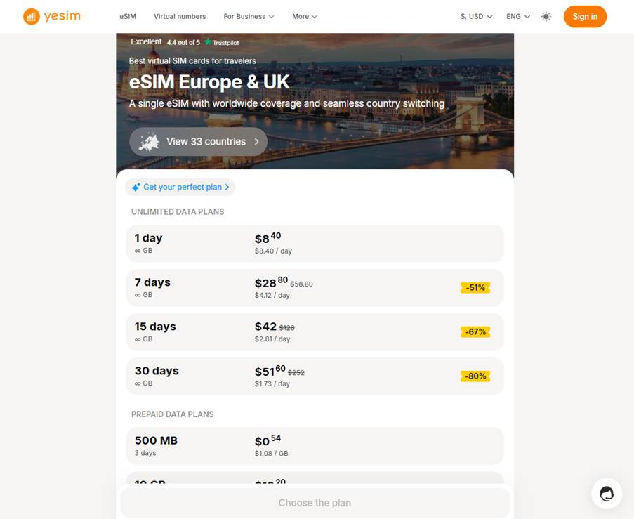 Yesim focuses on delivering reliable coverage for travelers with varying data needs. Its European eSIM plans are suitable for both city explorers and travelers visiting multiple countries.