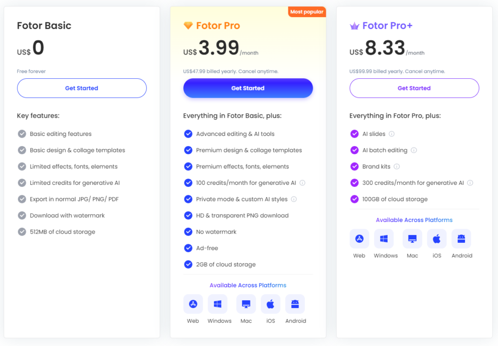 In the case of creators who review tools of AI video generation, the cost structure is the necessary factor to budget and plan the workflow. Fotor offers a freemium business model that provides a well-defined upgrade options and allows hobbyists to use it, and enables the power user features of professional features.