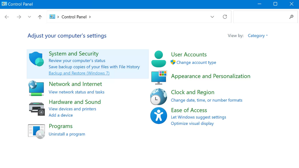Step 2: Click “Backup and Restore (Windows 7)” beneath “System and Security.” Tap “Restore my files.”