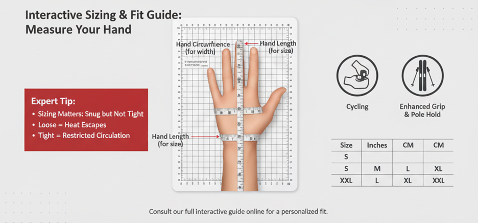 Sizing is crucial—ensure a snug but not tight fit. A loose fit lets heat escape, while a tight fit can restrict circulation, reducing the effectiveness of heating. Gloves should also have pre-curved fingers and articulation to enhance grip and movement. Expert Tip: Use an interactive sizing guide to find the best fit for cycling (grip) or skiing (pole hold).
