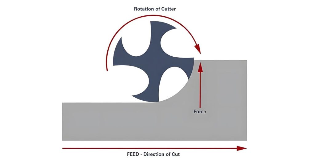 The workpiece can be raised with tangential forces. So, a firm fixture is needed. Up milling is suited to roughing hard metals such as steel, bronze, and brass. It effectively cuts material in large quantities and may produce a coarser finish and more tool wear.