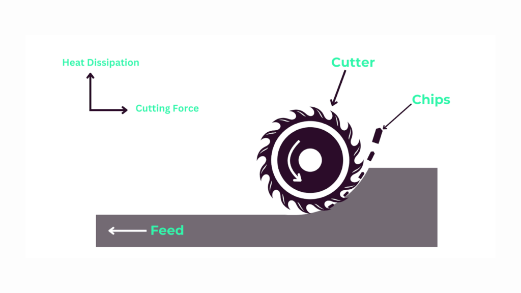 In up milling, the tool rotates against the direction of the feed of the workpiece. It makes thin chips at the beginning and becomes thicker as the cut is continued, and an additional cutting force is necessary.