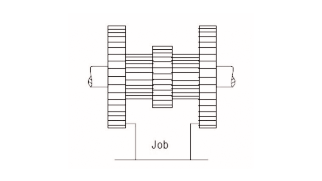 The gang milling process utilizes a set of cutters on the same arbor to mill multiple surfaces simultaneously. To the required width, spacers adjust the cutter positions. The process conserves machining time and is particularly suitable for parts with numerous parallel faces.