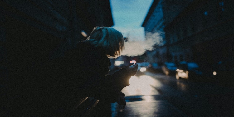 Person with short blonde hair smokes in a dimly lit street at dusk. Car headlights illuminate the scene, creating a moody, contemplative atmosphere.