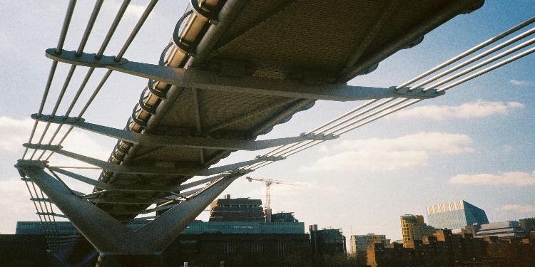 Aerial view of London shows Thames River, bridge, and cityscape with modern and historic buildings