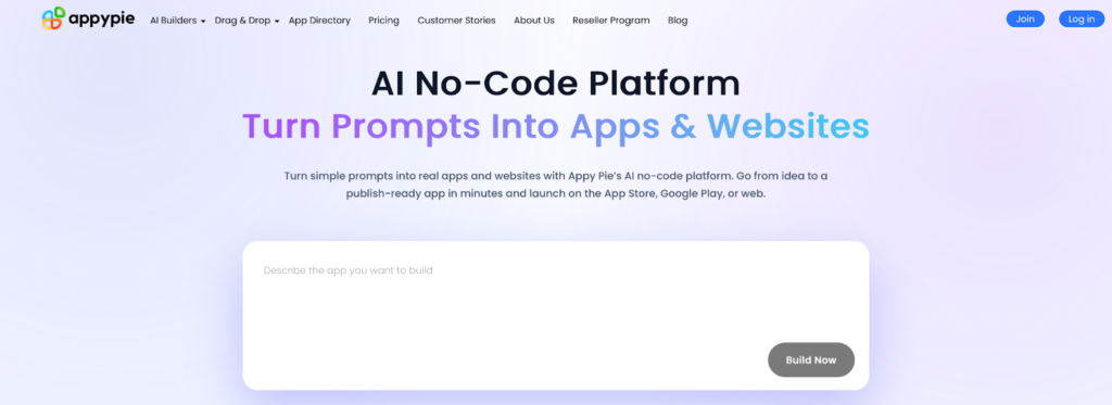 Appy Pie is an AI-powered no-code platform that enables non-technical users to create mobile and web applications through templates, drag-and-drop editing, and prompt-based generation. The system produces both interface and backend components, including databases, authentication, and admin controls, while supporting publication to Android, iOS, and web environments from a single dashboard. Its automation features connect apps with external services and business workflows through built-in integrations.